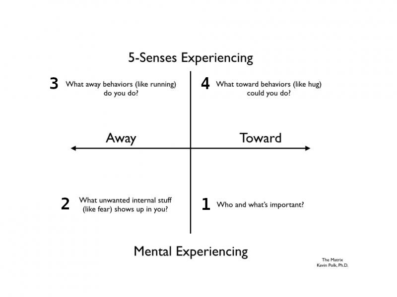 The following model was developed in 2009 by Dr. Kevin Polk, a clinical psychologist who writes primarily in the field of Action Commitment Therapy (ACT). There is an abundance of material online that works with The Matrix, and I recommend browsing it if you want to learn more or get some inspiration. There is also a very good YouTube video here that might be more helpful to you than my brief explanation or reading about it online.